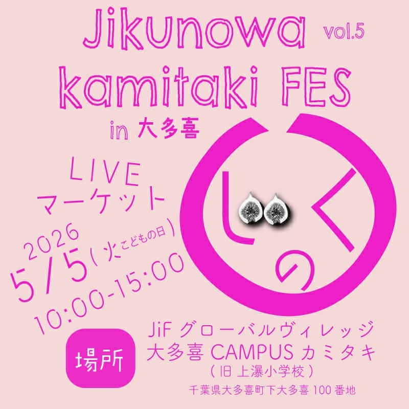 update.2026.2.13じくのわフェスvol.5開催日が2026年5月5日こどもの日祝日に旧上瀑小学校にて開催決定となりました。出店募集中です! [出店グループライン] じくのわ公式LINE(new) ご協力店さまへウェブサイトに御社名を掲載させていただきます(一口 1,000円 )協力店さま、ボランティアのご協力をいただける方は、下記お問い合わせフォームよりご連絡お待ちしております。 Contact お問い合わせ